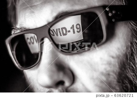 マスクとフェイスガードを付けた人物。感染に対するパニック。後退り、怯える。