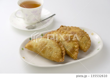 白背景に紅茶とカレー揚げパイ3個が皿に盛りつけティータイム