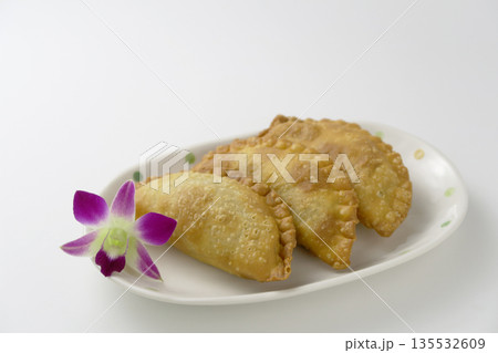 白背景にカレー揚げパイが3個とランの花が皿に盛りつけてある