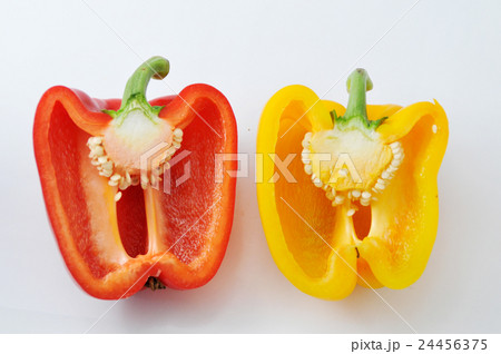 半分に切った赤パプリカと黄パプリカの断面。(白バック)