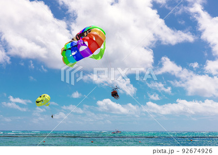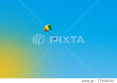 Parasailing in summer with colorful parachute, one persons in blue sky