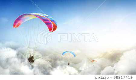 Paragliding multicolor. Paraglider flying over Landscape from the background Beauty nature mountain landscape of the sky. Paragliding Sports. Concept of extreme sport, taking adventure challenge.