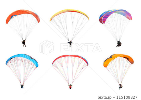 collection Bright colorful parachute on white background, isolated. Concept of extreme sport, taking adventure challenge.