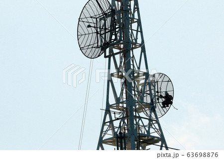 パラボラアンテナの付いた電波塔とレーダーアンテナ