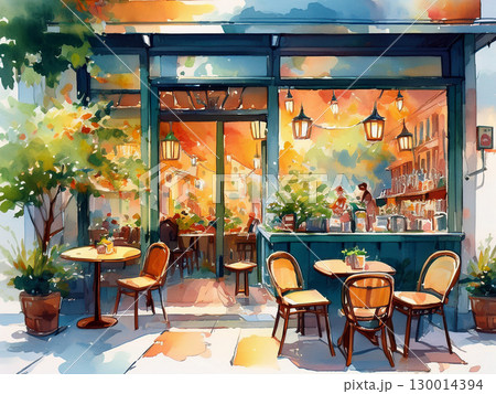 温かな灯りと緑に囲まれたおしゃれな街角カフェ|カフェ,テラス席,外観,照明,植物,水彩風