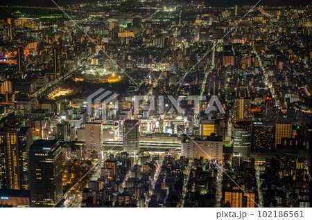 日本の東京都市景観 5月GW。3年ぶり、行動制限がないGW。夜の錦糸町駅前の街並みなどを望む=8日
