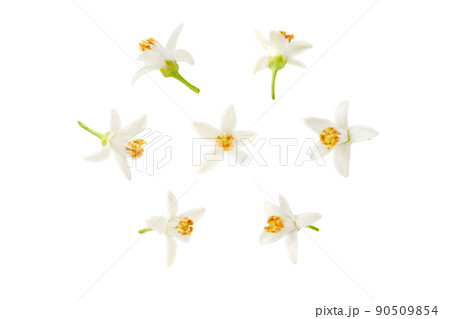 Bunch of white orange tree flowers and buds isolated on white background. Citrus sinensis flowering plant.
