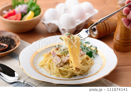 出来立て熱々のカルボナーラペンネ 高級感ある洋食ランチのイメージ素材