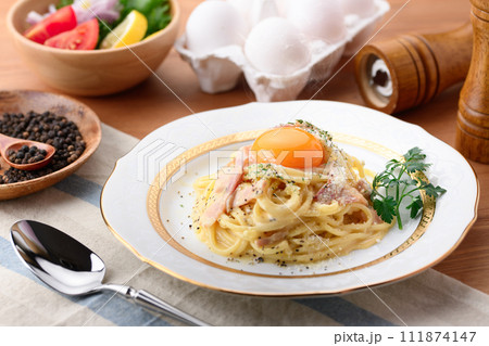 卵黄やカリカリに焼いたベーコンが入っているフェットチーネのカルボナーラを俯瞰で撮影