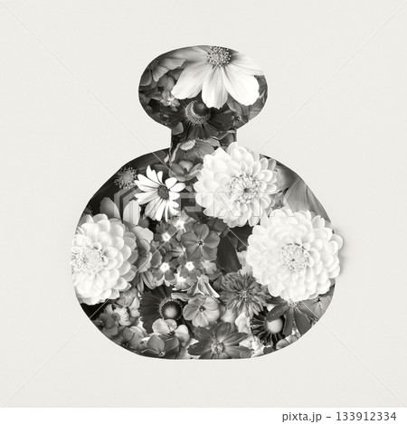 Demonstrating the colors of 2026 - Cloud Dancer. Bottle of cosmetics made of paper with summer flowers. Design for new product, promotion sale, cosmetic, presentation.