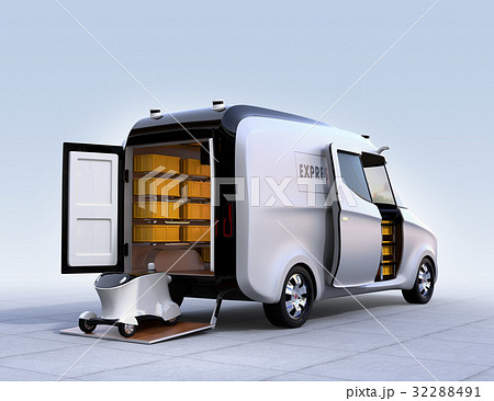 宅配バンのパワーゲートで自動配達ロボットを降し、荷物を配送するイメージ。ラスト1マイルコンセプト