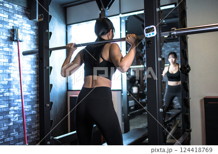 パワーラックマシンのバーベルを背負う、ジムで体を鍛えるかっこいい女性 筋トレ女子