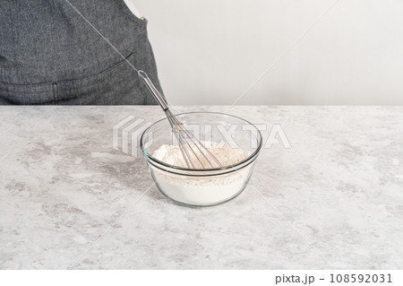 Mixing dry ingredients with a hand whisk in a large glass mixing bowl to bake banana cookies with chocolate drizzle.