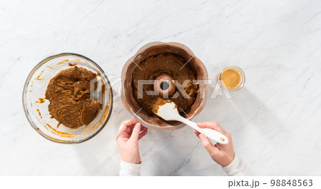 Filling metal bundt cake pan with cake butter to bake gingerbread bundt cake with caramel filling.