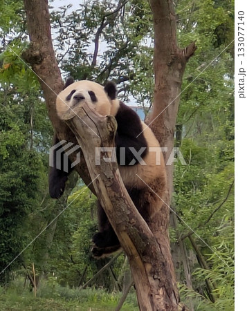 木の上で休むパンダの横顔写真