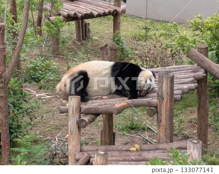 木製の遊具の上で寝る1頭のジャイアントパンダいる動物園の風景