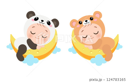 Cute sleeping baby in panda and bear costume on a moon