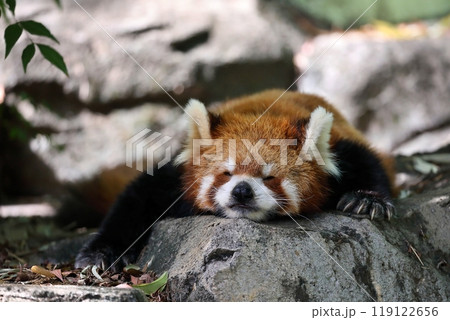 石の上にうつ伏せで寝るレッサーパンダ
