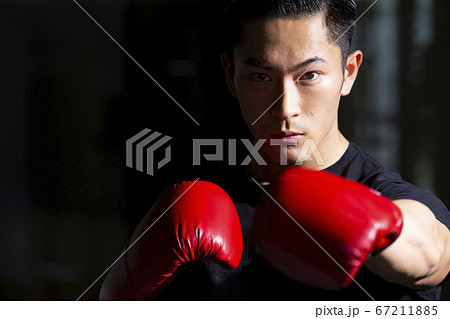 ボクシンググローブをつけてファイティングポーズをとる若い男性