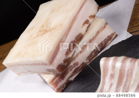 Pancetta Italian is a salt cured pork belly salume closeup on the wooden board. Horizontal