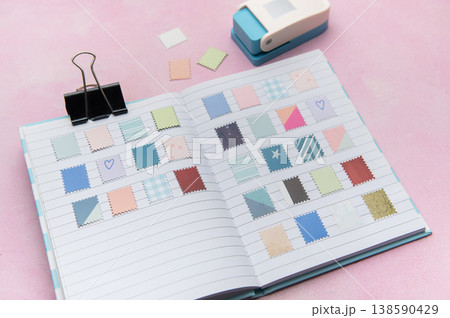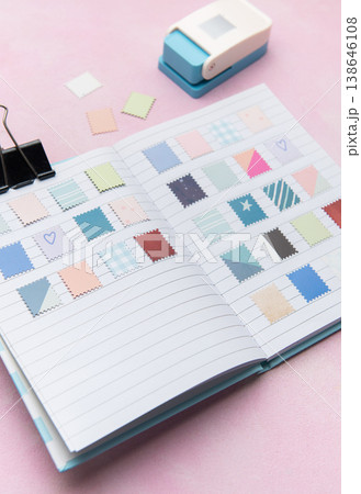 Crafting journal with decorative paper stamps and hole puncher
