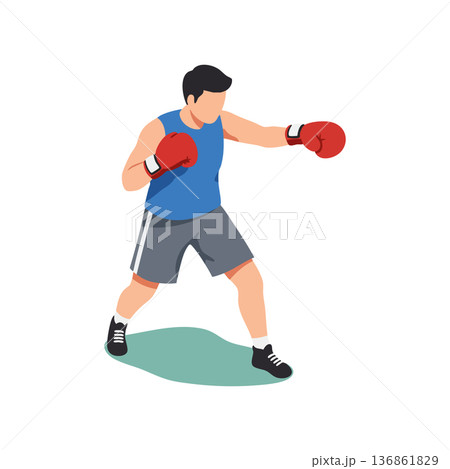 Boxer training with red gloves in blue shirt and gray shorts performing punch stance vector illustration