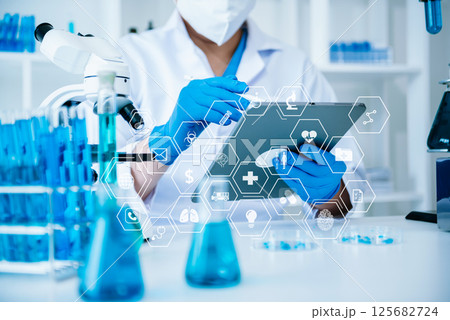 Dctor work on digital tablet healthcare doctor technology tablet using computer in laboratory study with vr icon