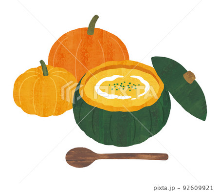 かぼちゃのポタージュのセット 料理・食べ物の手描き水彩イラスト素材