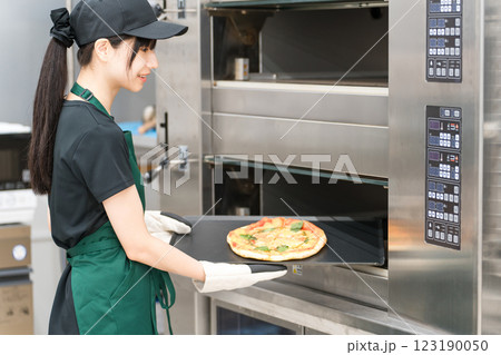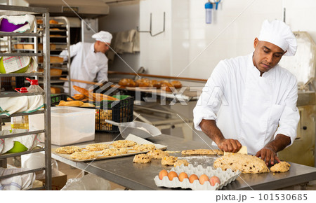 Famous bakery. Close up of freshly baked bread on the board with baker taking out hot bread from the