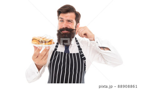 Winking cake baker twirling moustache and serving delicious pastry dessert isolated on white, chef