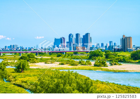 日本の川崎都市景観 6月。武蔵小杉駅前のタワーマンション群などを望む