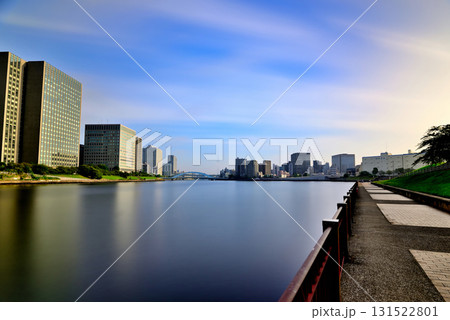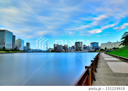 東京 隅田川 中央大橋からの永代橋とスカイツリー 長秒撮影