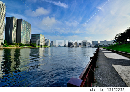 東京 隅田川 中央大橋からの永代橋と朝霧に包まれるスカイツリー