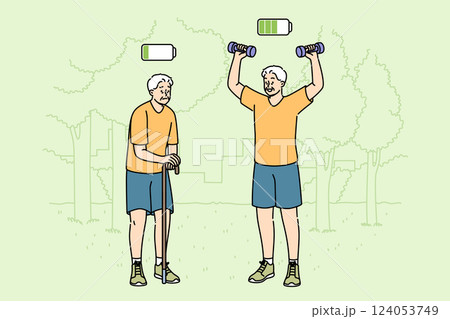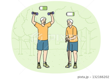 Elderly man plays sports in park and feels presence of energy, standing next to lethargic friend