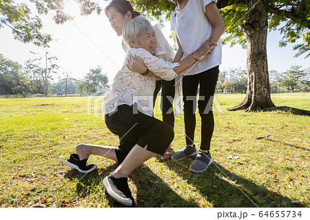 Female elderly was trying to stand up,asian daughter help,care,support her senior mother to stand up from ground after fell with vertigo,dizziness,old people in the accident slipped down while walking