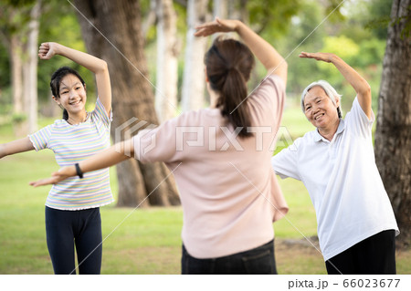 Asian woman is doing exercise activity for the old elderly and child girl,family workout and wearing medical mask outdoor after Coronavirus quarantine or Covid-19 lockdown,healthy senior,health care
