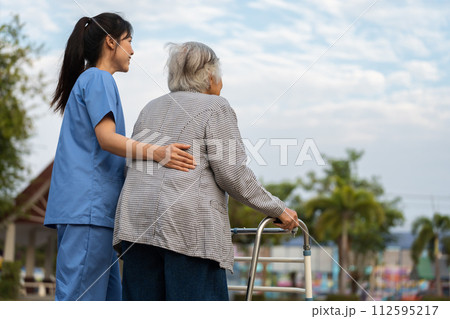 caregiver nurse support senior woman walking with walker in park