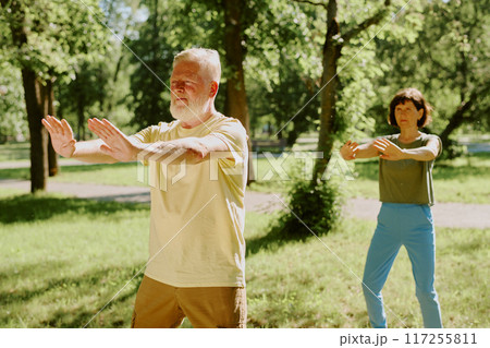 Senior silver-haired man with thick beard and brunette woman dressed in sportswear holding qigong pose to improve breath during open air workout in park