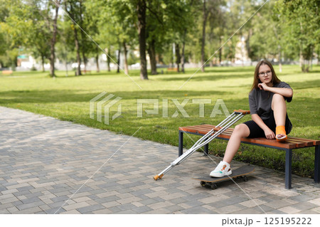 Disheartened girl resting on a park bench with crutches and skateboard nearby