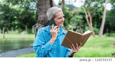 Senior Woman Talking on Phone and Reading Book in Park, Enjoying Leisure Time Outdoors