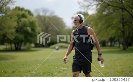Active Senior Man Enjoys Outdoor Walk with Headphones and Water Bottle in a Lush Green Park