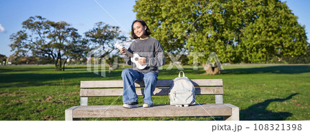 Beautiful young asian girl, student sits in park under tree and reading book, smiling, enjoying warm summer day outdoors
