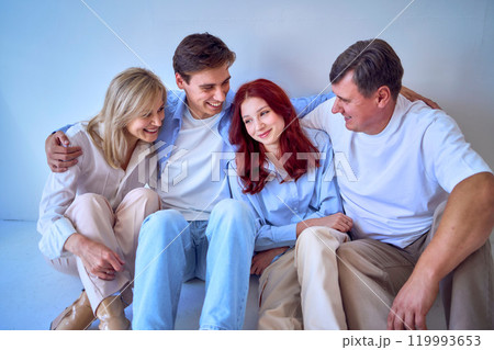 a family, middle-aged husband and wife, young adult son and teenage daughter, sitting on a white background, studio photo shoot