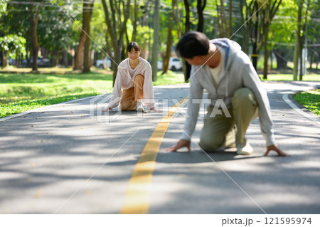 Young woman and middle aged father crouching down in starting position on pathway in a park