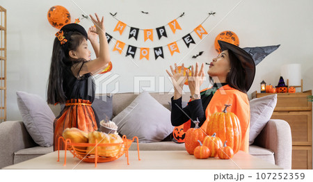 Happy family mother and child happy girl with Halloween at home together beautifully decorated. pretending to release air from a balloon at a child girl