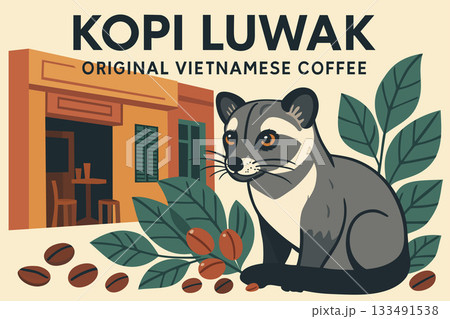 Original Vietnamese Coffee poster. Copi luwak. Asian palm civet animal in traditional Vietnamese coffee shop background surrounded by coffee beans and leaves