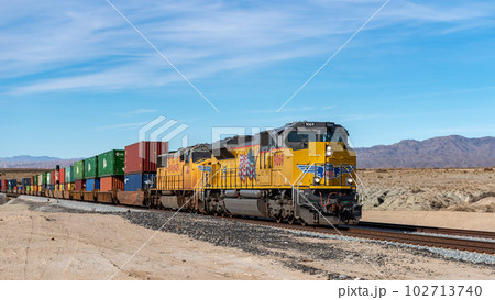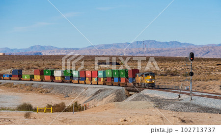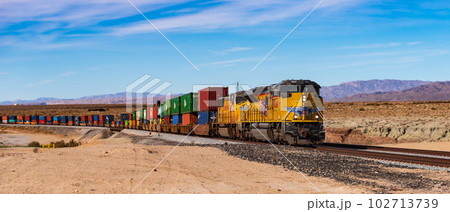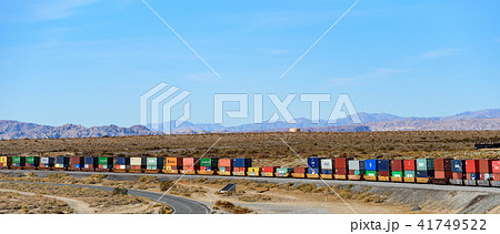アメリカ大陸を横断する長距離貨物列車のコンテナ 大パノラマ