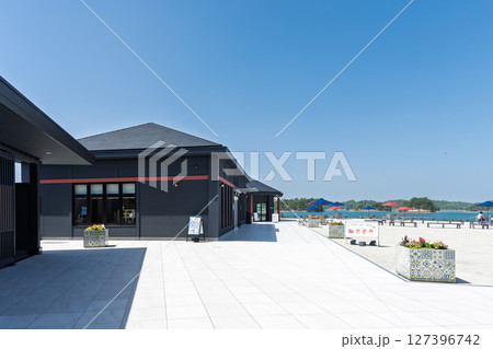 青空を背景に映える店舗・店内風景「天草パールガーデン& 海中水族館シードーナツ」