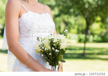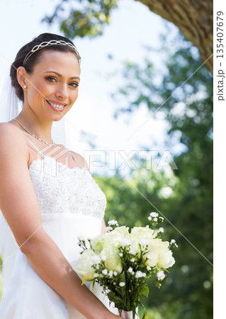Woman smiling, holding bouquet of white roses in garden wearing wedding gown and veil, copy space