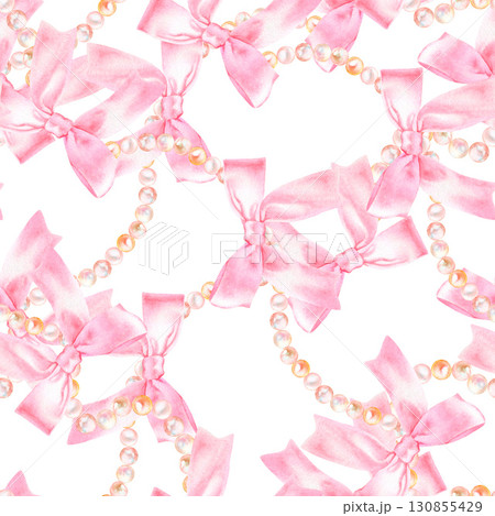 Seamless watercolor pattern with hand drawn pink bow and string of pearls.